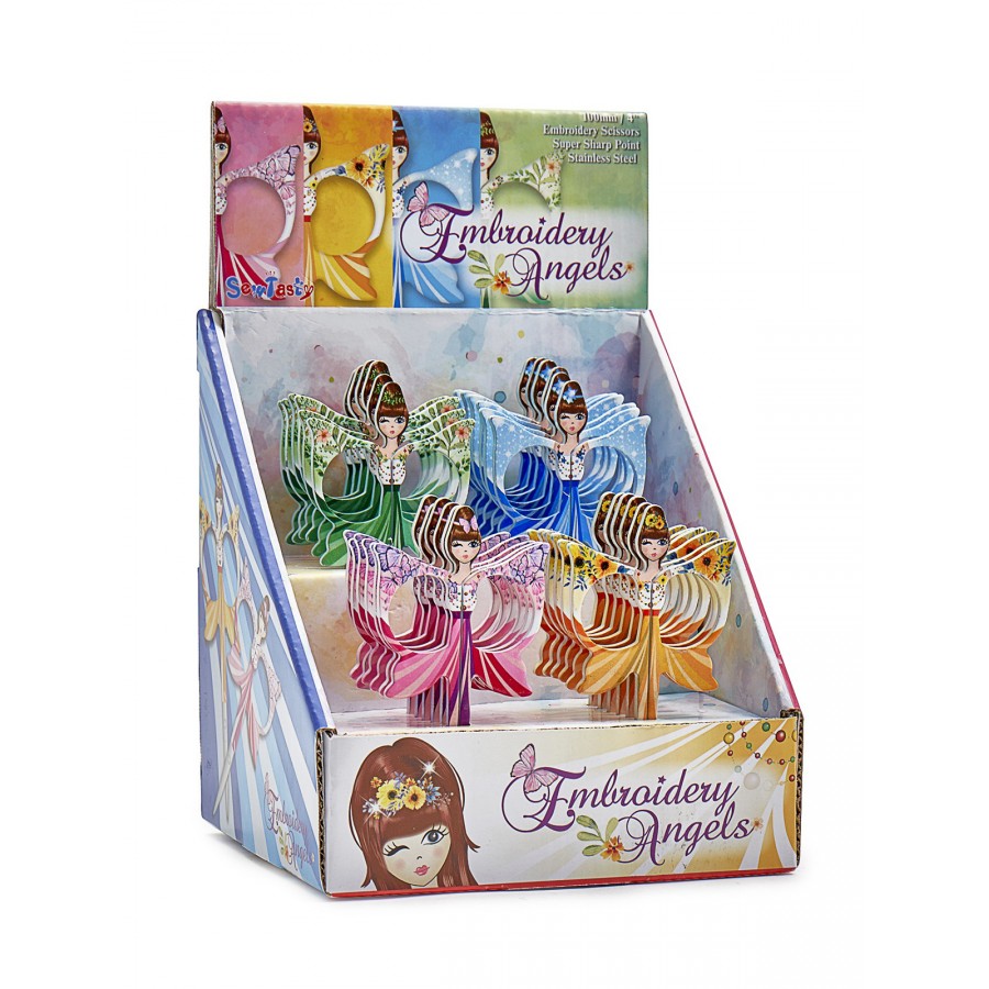 Набор ножниц для вышивания "Ангелочки" 10 см, в прикассовом стенде. Ножницы для вышивания 100 мм. Острый и тонкий наконечник для точной резки. Лезвия из нержавеющей стали. Представлен на цветном бумажном дисплее. Цвета: синий, зелёный, розовый, жёлтый. Размеры изделия: 15 x 13 x 15 см. Общий вес изделия: 730 г.