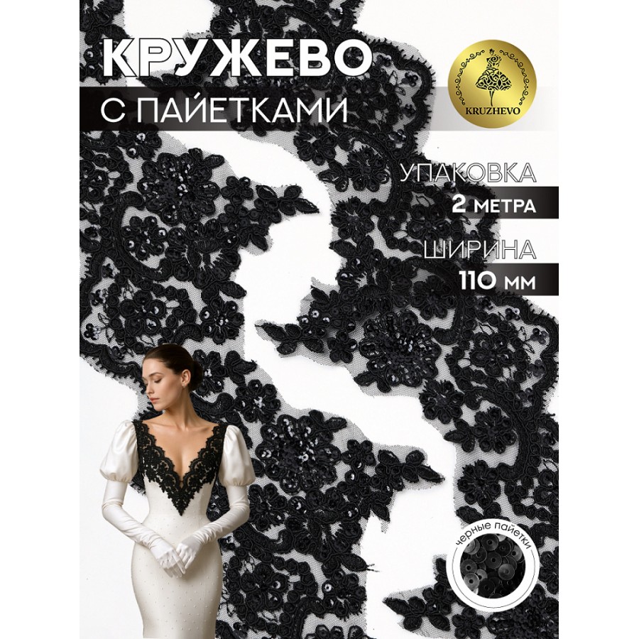 Кружево на сетке с пайетками TBY G1232 110мм цв.черный уп.2м