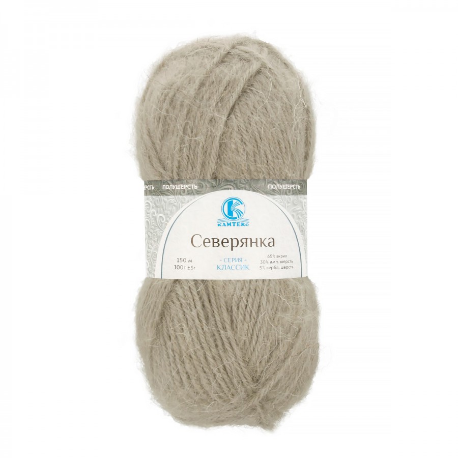 Пряжа "Северянка". ТМ Камтекс. Для вязания предметов одежды и аксессуаров. Сезон: Демисезон / Зима. В "Северянке" верблюжья шерсть прекрасно взаимодействует с овечьей шерстью, которая устойчива к сминанию, и акрилом, добавляющим прочность нити. Изделия из этой пряжи будут дарить «сухое тепло». В них всегда будет комфортно при любой температуре. Нить средней толщины, мягкая и приятная на ощупь, имеет небольшой ворс. Работать с такой нитью удобно и просто. Из этой пряжи хорошо прослужат чулочно-носочные изделия, всевозможные зимние аксессуары: шарфы, шапки, перчатки, митенки и гетры. Шали и палантины согреют даже в самую сильную стужу. Цветовая карта этой пряжи – только натуральные теплые оттенки. Из-за того, что пряжа - ОЧЕНЬ гигроскопичный товар, она легко набирает и легко отдаёт влагу. Указанный на мотке вес - это так называемый "кондиционный" вес. Нормативная влажность пряжи - 18,25\%, а реальная обычно бывает меньше - 14-15\%. Поэтому, при взвешивании пряжи в "обычных" комнатных условиях, данные по весу могут отличаться от указанных на мотке. Контрольное взвешивание, при определенной влажности и температуре, должно проводиться только в спец. лабораториях. Претензии по весу принимаются только при наличии официального заключения лабораторий, либо при очевидной разнице - более 30\%. Тип пряжи: Классическая Цветовая палитра: однотонные цвета Толщина нити: толстая Длина нити: 150 м Вес: 100 г Состав: 65\% акрил, 30\% шерсть, 5\% верблюжья шерсть Рекомендуемый диаметр спиц/крючка для пряжи - 3.0-5.0 мм Примечание: цвет товара может отличаться от цвета фото