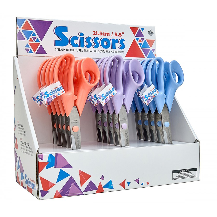 Ножницы портновские 21,5 см / 8 1/2 дюйма. Лезвия из нержавеющей стали. Эргономичные ручки удобной посадки. Идеально подходит для раскроя легких и средних тканей. Цвет: синий, сиреневый, розовый. Материал содержимого: Нержавеющая сталь, АБС-пластик Размеры дисплея (в закрытом виде): 29 х 14 х 22,5 см. Размеры дисплея (в сборе): 29 x 14 x 29 см. Вес брутто дисплея: 1520 г.