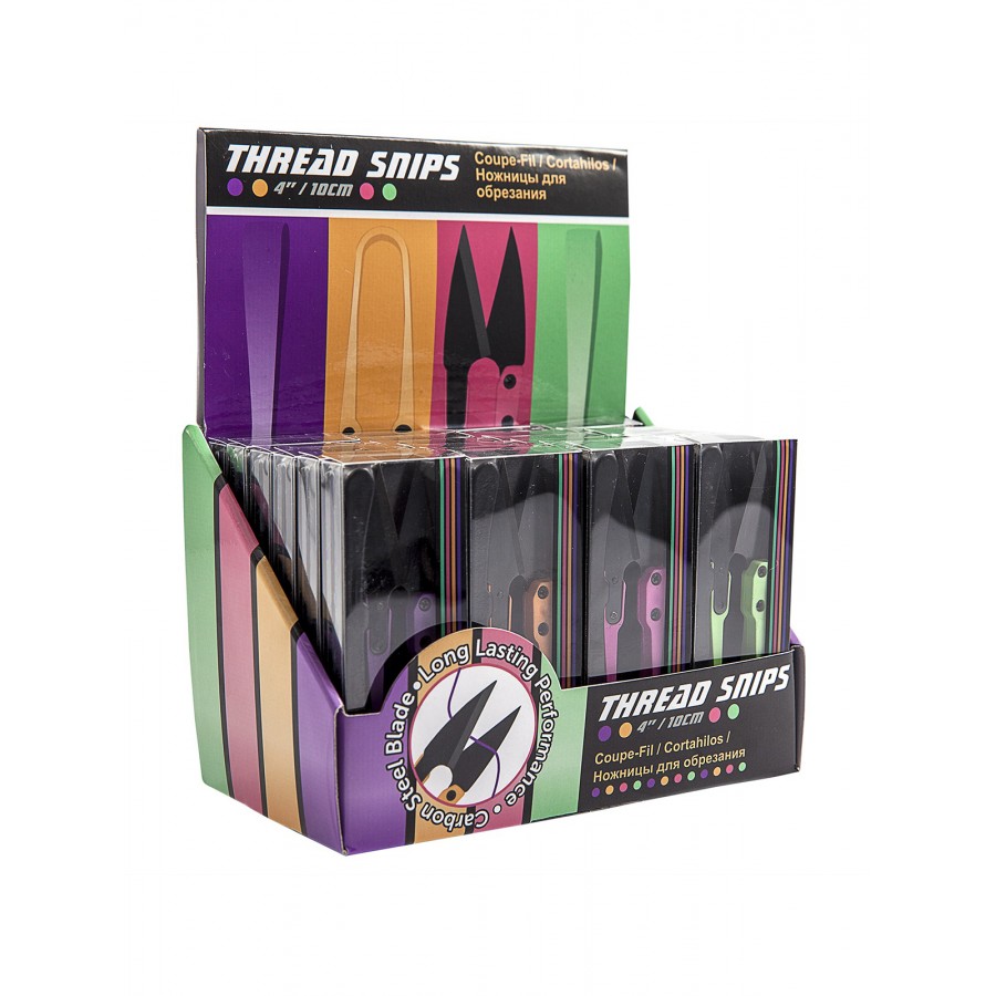 Ножницы-сниппер  для обрезки нитей , 10 см, в прикассовом стенде. Лезвия из углеродистой стали повышают эффективность резки. Упрощенный эргономичный дизайн. Упаковано в высококачественную цветную ПЭТ-упаковку. Цвета: лайм, оранжевый, розовый, фиолетовый. Размеры изделия: 9 x 6,5 x 11,5 см. Общий вес изделия: 550 г.