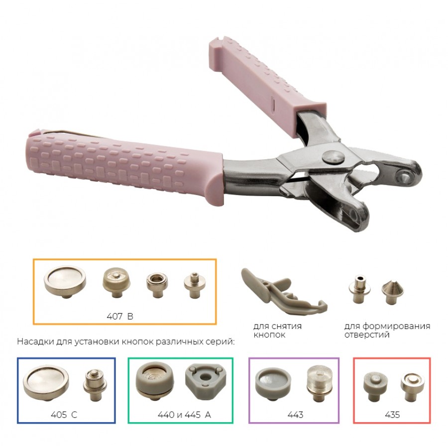 Универсальный стартовый набор «5 в 1» для прочной установки кнопок, люверсов, пластиковых кнопок, кнопок с цельным верхом и кольцом, а также кнопок для анорак/курток. Одна пара плоскогубцев для всего. Каждый набор содержит: Щипцы для установки люверсов, сменные насадки для 5 видов работ, инструменты для пробивки отверстий диаметром 3 мм или 4 мм, съёмник для насадок, инструкции на нескольких языках. Подходит для всех застёжек Hemline: Сверхпрочные защелки 405 серии C, 15 мм Люверсы 4 мм, серия 435 Пластиковые защелки 12,4 мм, серии 443 11-миллиметровые цельные и кольцевые модные застёжки 440 и 445 серии A 15-миллиметровые кнопки для анорака/куртки серии 407 B Мягкие пластиковые ручки удобно держать. Материал корпуса: пластик, сталь Размеры изделия: 23,5 x 10,3 x 2,5 см. Вес брутто: 310 г.