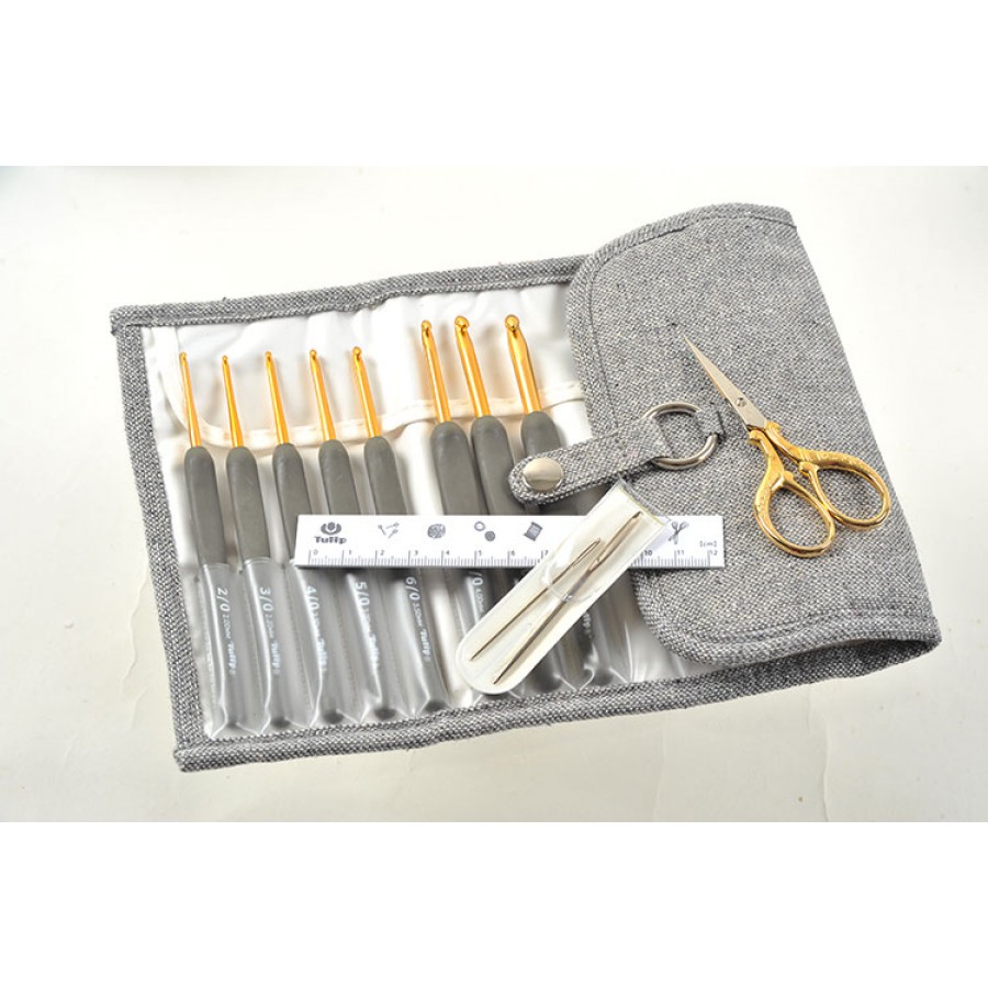 Набор крючков для вязания с ручкой "ETIMO" (в наборе: органайзер, крючки (2мм, 2,2мм, 2,5мм, 3мм, 3,5мм, 4мм, 5мм, 6мм), линейка, ножницы, иглы для пряжи 2шт), алюминий/пластик, золотистый/серый/черный, 8 видов крючков в наборе